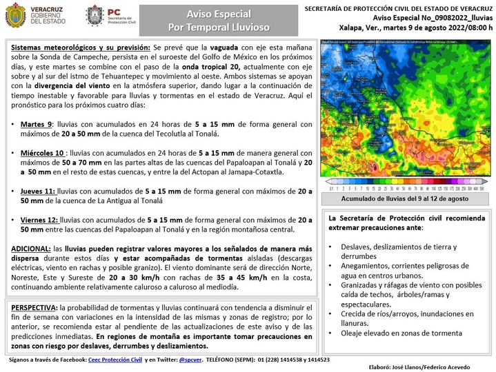 Sistemas meteorológicos y su previsión: Se prevé que la vaguada con eje esta mañana sobre la Sonda de Campeche, persista en el suroeste del Golfo de México en los próximos días, y este martes se combine con el paso de la onda tropical 20, actualmente con eje sobre y al sur del istmo de Tehuantepec y movimiento al oeste. Ambos sistemas se apoyan con la divergencia del viento en la atmósfera superior, dando lugar a la continuación de tiempo inestable y favorable para lluvias y tormentas en el estado de Veracruz. Aquí el pronóstico para los próximos cuatro días: