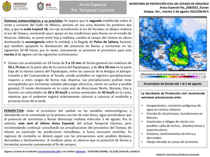 Sistemas meteorológicos y su previsión: Se espera que la vaguada establecida sobre el oeste y suroeste del Golfo de México, persista en esa zona durante los próximos dos días, y que la onda tropical 18, con eje actualmente al sur de Yucatán, se ubique mañana al sur de Oaxaca, mostrando poco apoyo en las condiciones para lluvias en el estado de Veracruz. Además, se prevé entre hoy y mañana, cambie el campo del vientos en altura dominando la convergencia sobre la entidad, y la llegada de Polvo de Sahara, factores que también apoyarán la disminución del potencial de lluvias y tormentas en las siguientes 24-48 horas; por lo tanto, únicamente se presenta el pronóstico para este martes 2 de agosto con las siguientes estimaciones: