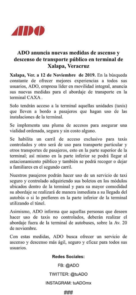 Mediante un comunicado la empresa ADO informo a la comunidad que en busca de una vialidad “ordenada, segura y sin costo alguna”, el acceso a la terminal será definida por carriles.