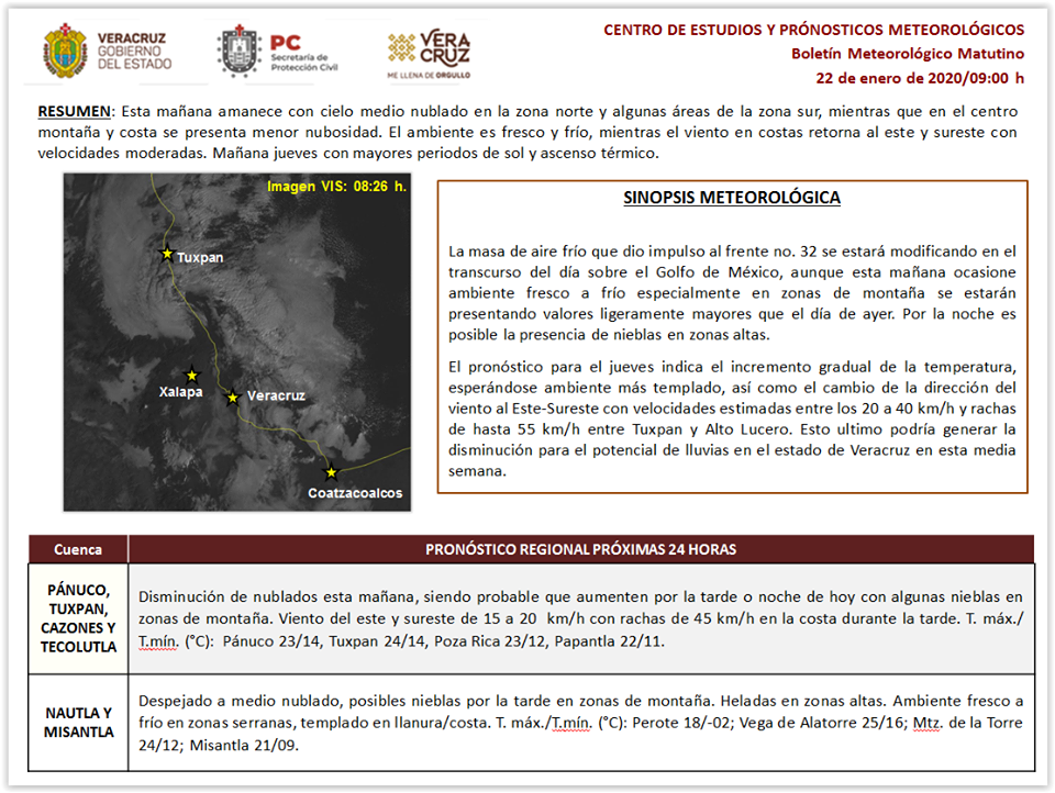 *Regiones montañosas del centro*: Disminución de la nubosidad conforme avance la mañana, para aumentar nuevamente por la tarde. Probabilidad de nieblas y lloviznas dispersas por la tarde-noche. Viento dominante del Sureste de 10 a 20 km/h. Los valores de la temperatura máxima aumentan, ambiente frío a fresco. Heladas en partes altas. Tmáx/Tmín. 19-21/8-11°C (menores en el valle de Perote).