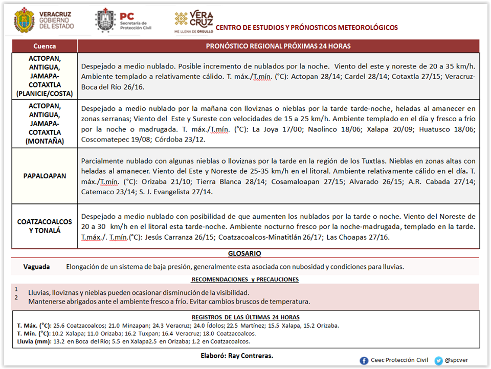 *Región Sur*: (Cuencas del Papaloapan, Coatzacoalcos y Tonalá, incluyendo Los Tuxtlas): Disminución de la nubosidad conforme avance la mañana, aumentando nuevamente por la tarde con probabilidad de nieblas y lloviznas dispersas durante la misma tarde y hasta la madrugada. Viento del Este y Noreste de 20 a 35 km/h en la costa. Los valores de la temperatura máxima aumentan ligeramente. Ambiente frío a fresco por la noche-madrugada. TMáx/TMín 25-28/16-19°C (Menores en la región de los Tuxtlas).