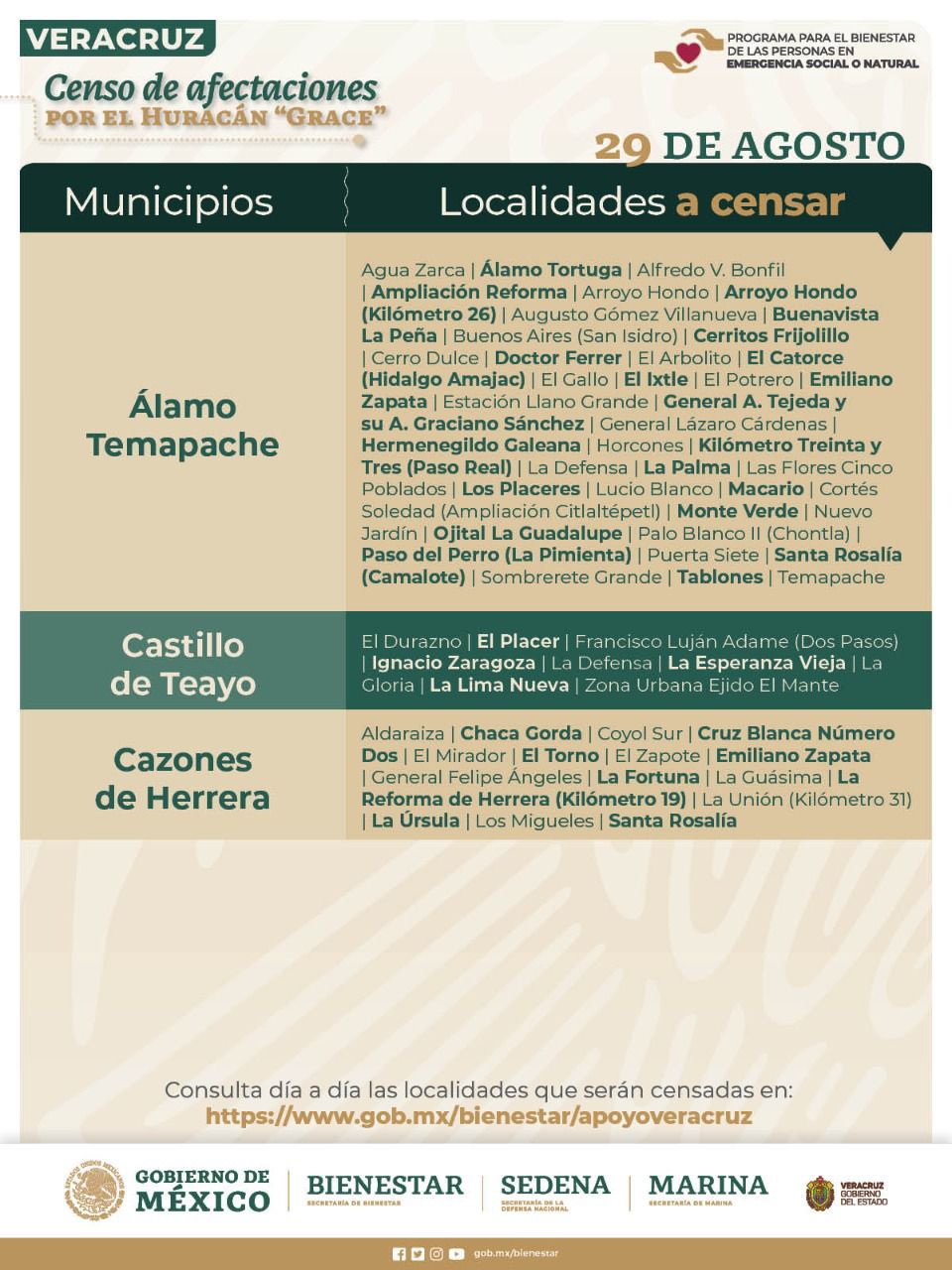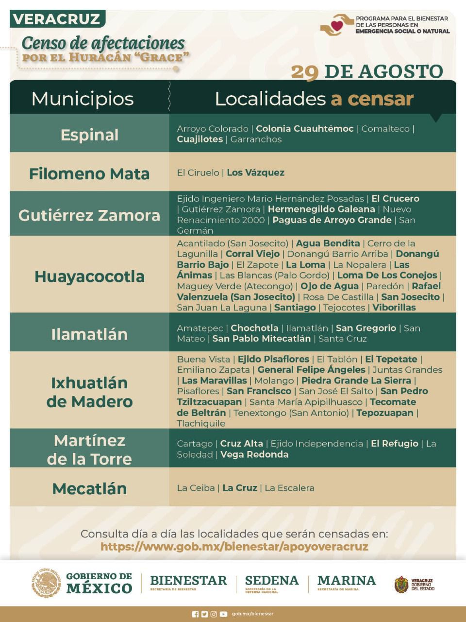 Vía redes sociales, el gobernador Cuitláhuac García Jiménez informó el seguimiento del censo de afectaciones por el Huracán Grace en las regiones Huasteca Baja y Totonaca, así como las localidades donde corresponde el registro este domingo.