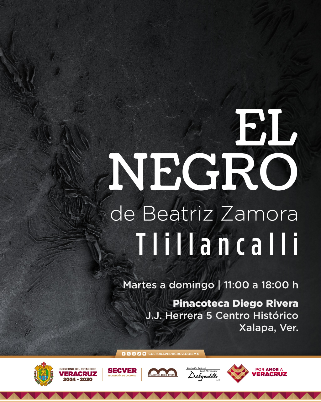 La Secretaría de Cultura de Veracruz (SECVER) invita a visitar la exposición El Negro de Beatriz Zamora, que permanecerá abierta hasta el mes de noviembre en la Pinacoteca Diego Rivera. La entrada es gratuita de martes a domingo, en horario de 11:00 a 18:00 horas.