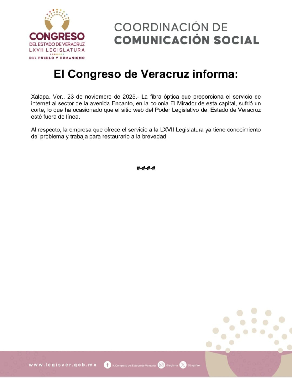 Xalapa, Ver., 23 de noviembre de 2025.- La fibra óptica que proporciona el servicio de internet al sector de la avenida Encanto, en la colonia El Mirador de esta capital, sufrió un corte, lo que ha ocasionado que el sitio web del Poder Legislativo del Estado de Veracruz esté fuera de línea.