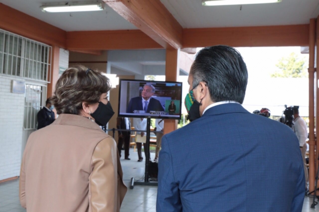Xalapa, Ver., 30 de agosto de 2021.- Desde la Escuela Secundaria Técnica No. 3, la secretaria de Educación Pública, Delfina Gómez Álvarez, acompañada por el gobernador Cuitláhuac García Jiménez, inauguró el ciclo escolar 2021-2022; vía remota, desde Palacio Nacional, el presidente Andrés Manuel López Obrador dio la bienvenida a los estudiantes durante su conferencia de prensa matutina.
