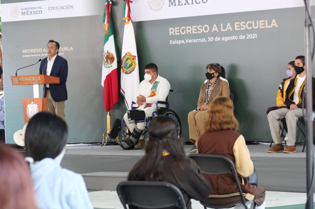 Por su parte, el secretario de Educación de Veracruz, Zenyazen Escobar García, destacó que, a un año y cinco meses, a través de diferentes estrategias la educación no ha parado en la entidad y se cuenta además con el respaldo del presidente Andrés Manuel López Obrador, lo cual queda reflejado en la construcción y mejora de la infraestructura y mobiliario de las escuelas.