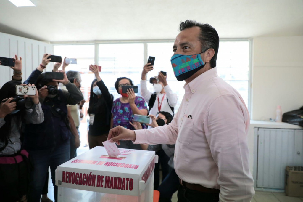 Xalapa, Ver., 10/04/22.- Esta mañana, el gobernador Cuitláhuac García Jiménez emitió su voto en la consulta de Revocación de Mandato en la casilla ubicada en la escuela Primaria Congreso, en la colonia que lleva el mismo nombre.