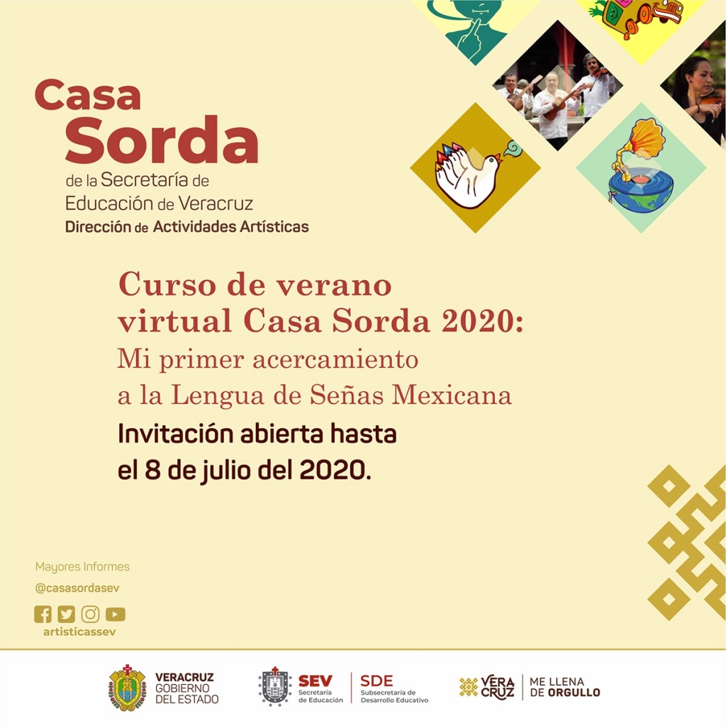 La Secretaría de Educación de Veracruz (SEV), a través de la Subsecretaría de Desarrollo Educativo y la Dirección de Actividades Artísticas, invita al “Curso de verano virtual Casa Sorda 2020: Mi primer acercamiento a la Lengua de Señas Mexicana”, del 20 al 24 de julio de 11:00 a 13:00 horas.