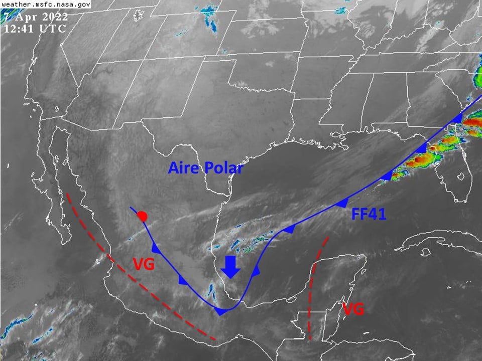 *En superficie*: *frente frío 41* desde el noreste de Estados Unidos hasta la región de Los Tuxtlas en Veracruz; *masa polar* sobre el norte, noreste y este del país; *vaguada* con eje desde el centro del Golfo de California hasta la sonda de Campeche.