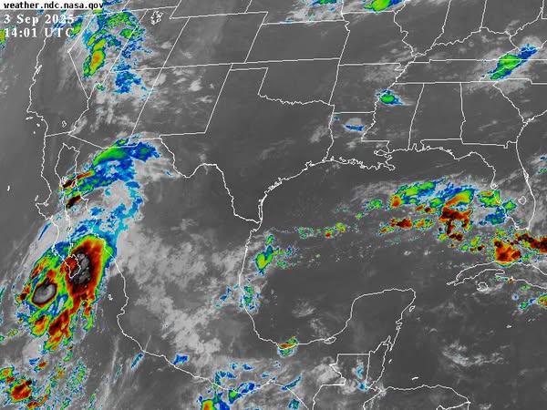 *En los trópicos:* cuenca del Pacífico oriental; el huracán *Lorena* con centro a 165 km al suroeste de Los Cabos, BCS, vientos máximos sostenidos de 120 km/h y movimiento actual al noroeste a 24 km/h, amenaza con impactar en el norte de Baja California Sur la mañana del viernes. En el Atlántico, una onda tropical al oeste-suroeste de las Islas de Cabo Verde mantiene 70% de probabilidad para evolucionar a Ciclón Tropical mientras se mueve hacia el oeste-noroeste. Para más información, consulte el Boletín Tropical.