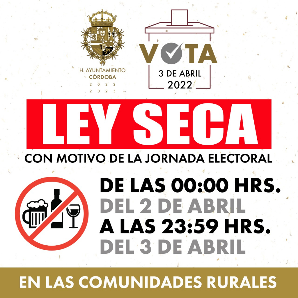 Córdoba, Ver., (01 de abril de 2022). - A partir de las 00:00 horas de este sábado 2 y 3 de abril, las 39 comunidades de Córdoba deberán implementar ley seca estipulada por el Cabildo de Córdoba por la elección de Agentes y Subagentes Municipales.