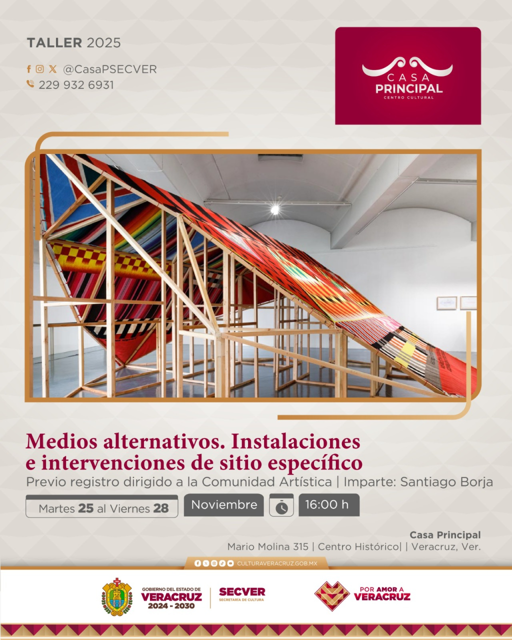 La Secretaría de Cultura de Veracruz (SECVER) invita al público interesado en el arte contemporáneo a participar en el taller teórico-práctico Medios Alternativos. Instalaciones e intervenciones de sitio específico, que se realizará del 25 al 28 de noviembre, en horario de 17:00 a 20:00 horas, en el Centro Cultural Casa Principal, en el puerto de Veracruz. El cupo es limitado.