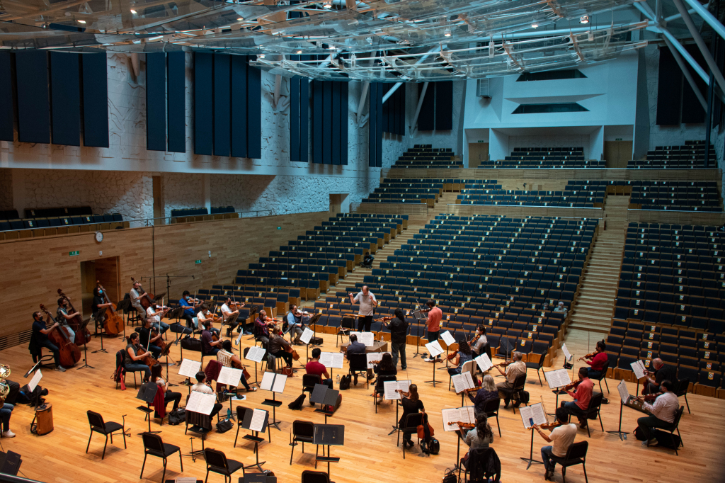 Pie de foto: Martin Lebel dirigiendo a la OSX con solistas en ensayo desde Tlaqná.