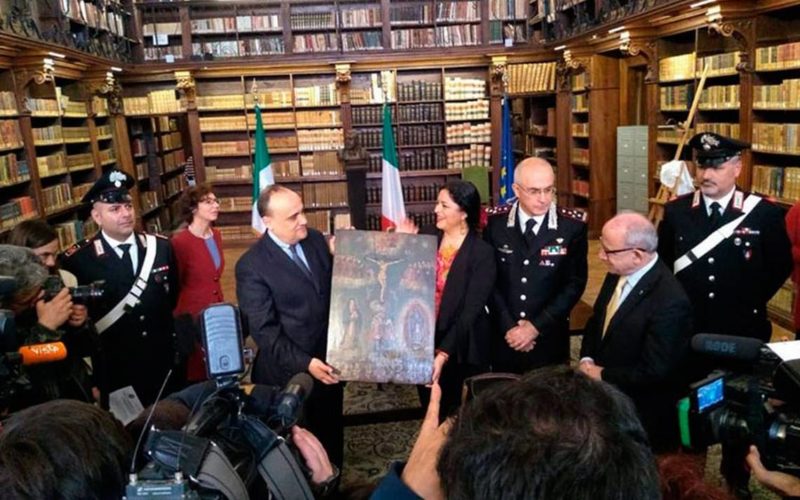 Unos 594 tesoros artísticos manifestación de la religiosidad popular mexicana y que eran preservados ilegalmente en Italia, fueron restituidos hoy por el gobierno de ese país a la secretaria de Cultura de México, Alejandra Frausto Guerrero.