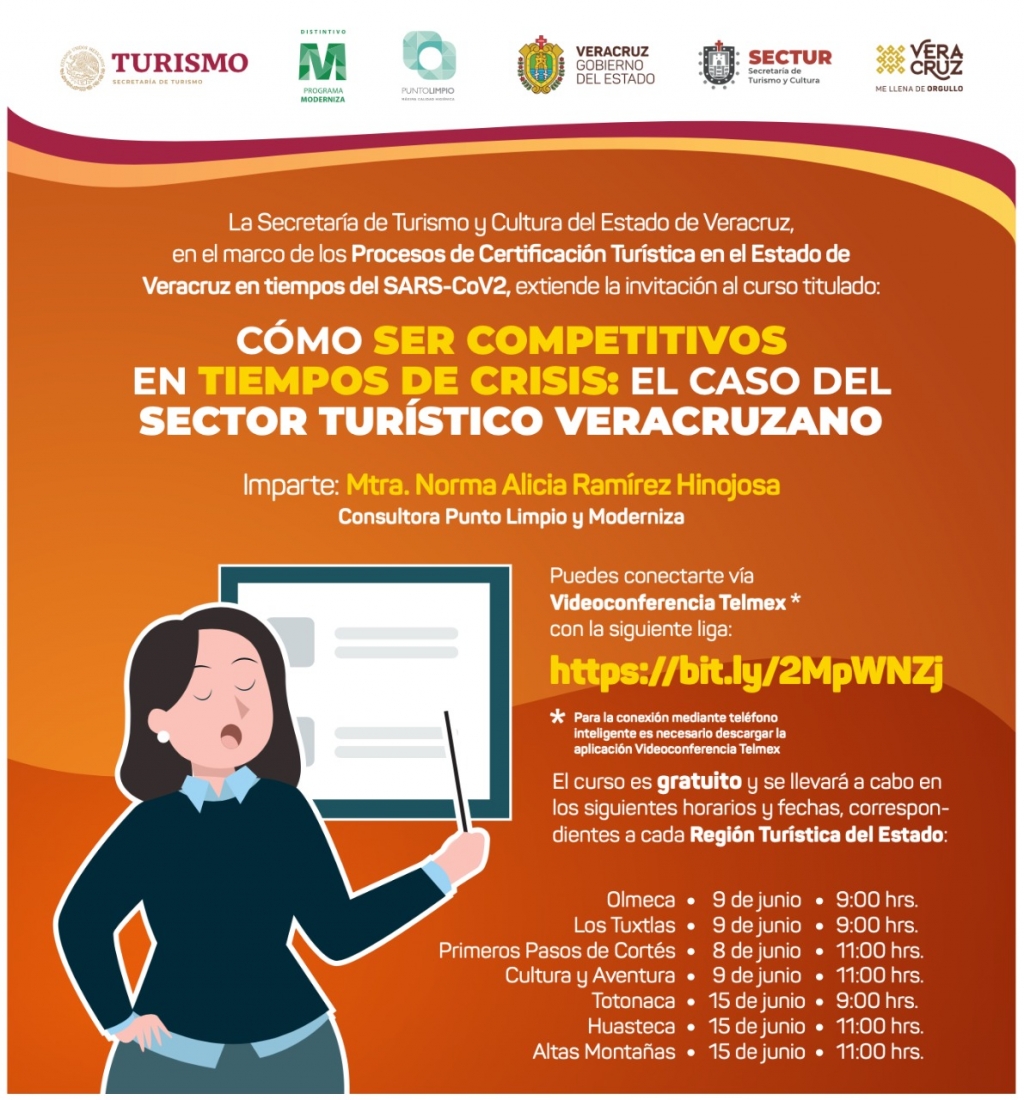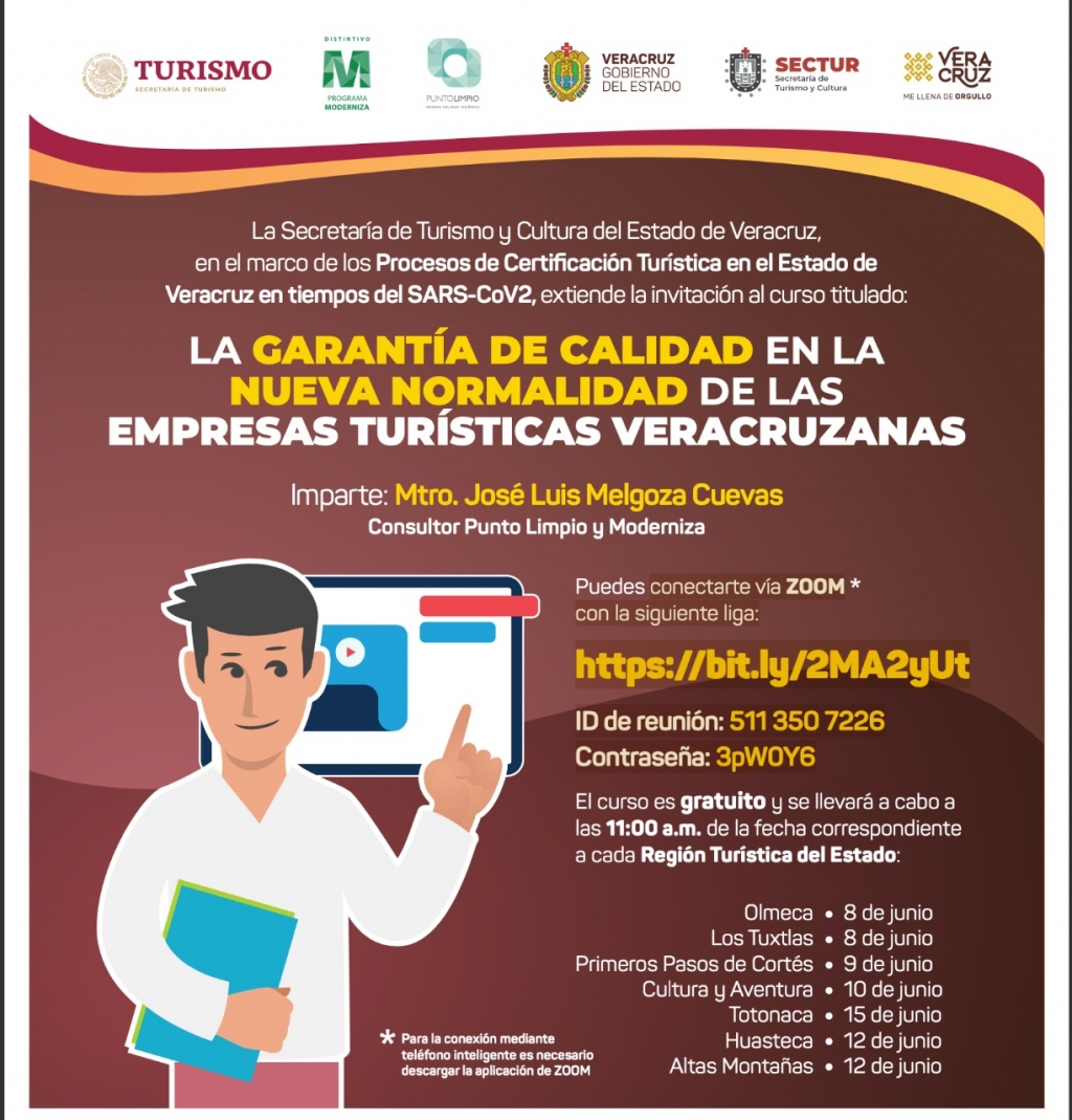 El director general de Servicios Turísticos de la dependencia, Omar Castro Prado, informó que “La garantía de calidad en la Nueva Normalidad de las Empresas Turísticas Veracruzanas” y “Gestión de la Inteligencia para la empresa turística Veracruzana: hacia la nueva normalidad”, se realizarán vía ZOOM.