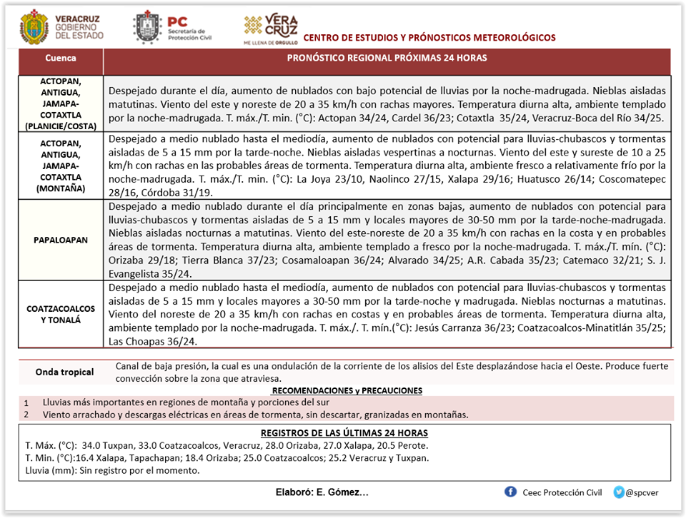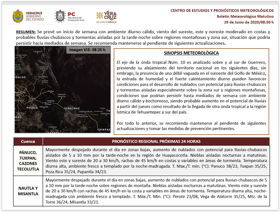 *Región Sur*: (Cuencas del Papaloapan, Coatzacoalcos y Tonalá, incluyendo Los Tuxtlas): Despejado a medio nublado por la mañana, aumentando los nublados y la probabilidad de lluvias y tormentas (actividad eléctrica y ráfagas de viento) aisladas por la tarde-noche y madrugada. Acumulados estimados de 5 a 20 mm con máximos de 30 a 50 mm, estos últimos especialmente en regiones montañosas. Visibilidad reducida por calina. Nieblas nocturnas a matutinas. Viento dominante del Noreste de 20 a 35 km/h en la costa. Ambiente caluroso al mediodía-tarde. Tmáx./Tmín. 33-37/24-27°C (Menores en la región de los Tuxtlas).