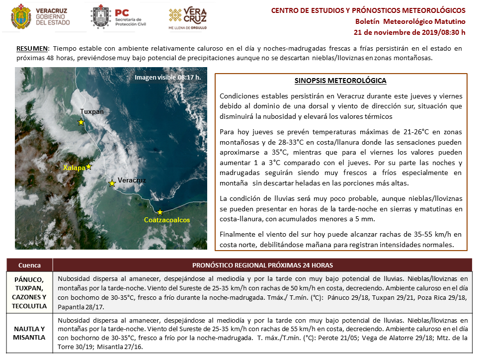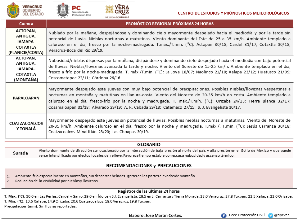 *Región Sur*: (Cuencas del Papaloapan, Coatzacoalcos y Tonalá, incluyendo Los Tuxtlas): Despejado a medio nublado, aumentando los nublados y la probabilidad lloviznas y lluvias dispersas especialmente en regiones montañosas. Acumulados estimados en 24 horas menores de 5 mm. Nieblas en Los Tuxtlas. Viento dominante del Norte y Noreste de 20 a 30 km/h en la costa. TMáx/TMín 28-31/19-22°C (Menores en la región de los Tuxtlas).