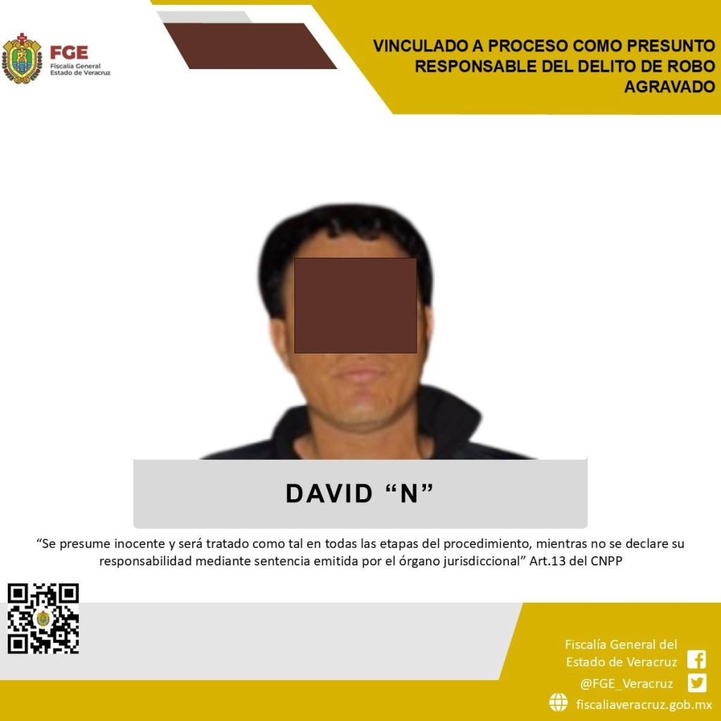 Boca del Río, Ver., a 3 de febrero de 2026.- La Fiscalía General del Estado, a través de la Fiscalía Regional Veracruz obtuvo vinculación a proceso en contra de David “N” como presunto responsable del delito de robo agravado cometido en agravio de una farm