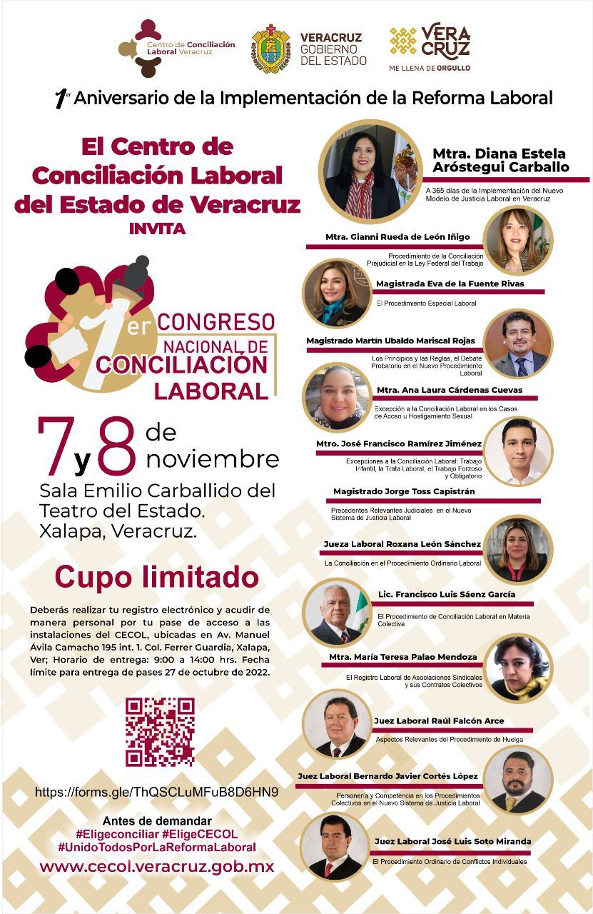 Con el tema “A 365 días de la Implementación del Nuevo Modelo de Justicia Laboral en Veracruz”, que expondrá la propia titular del Centro de Conciliación en la entidad, también se contará con la intervención de 11 conferencistas que abordarán temas de conciliación y procedimientos de justicia laboral. Las ponencias se realizarán en la sala “Emilio Carballido” del Teatro del Estado.