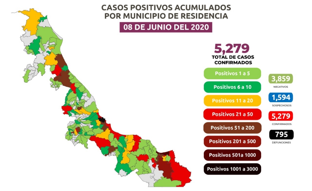 La cifra de positivos acumulados es de 5 mil 279 en 147 demarcaciones; 2 mil 863 recuperados, mil 621 en vigilancia y 663 activos: Veracruz 1978, Coatzacoalcos 570, Poza Rica 410, Boca del Río 226, Minatitlán 225, Córdoba 139, Tuxpan 124, Xalapa 121, Cosoleacaque y Medellín 88, Orizaba 79, Papantla 77, Cosamaloapan 60, Coatzintla 57, Fortín 43, San Andrés Tuxtla 42, Alvarado y Tihuatlán 40, Nanchital 37, Las Choapas y Martínez de la Torre 33, Perote 31, La Antigua 29, Tierra Blanca 28, Agua Dulce 27 y Río Blanco 24.