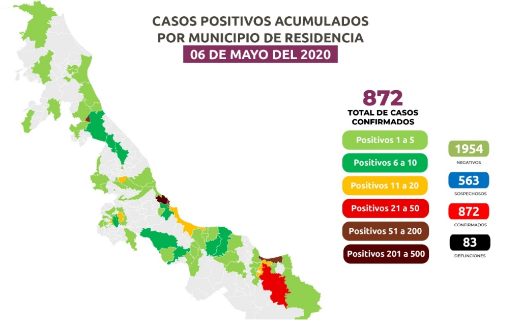 La cifra de positivos es 872 en 77 demarcaciones: Veracruz 345, Coatzacoalcos 110, Poza Rica 67, Boca del Río 66, Minatitlán 25, Xalapa 19, Cosoleacaque 14, Alvarado y Orizaba 12, Córdoba 11; Fortín, Medellín y Papantla 9; Cosamaloapan, San Andrés Tuxtla y Tierra Blanca 8; Santiago Tuxtla 7; Ixtaczoquitlán, Martínez de la Torre y Misantla 6; Coatzintla, Emiliano Zapata, Nanchital y Tuxpan 5; Acayucan, Amatlán de los Reyes, Cerro Azul, Jáltipan, José Azueta, Perote, Tihuatlán y Tlacotalpan 4; Agua Dulce, Ayahualulco, Cazones y Mariano Escobedo 3.