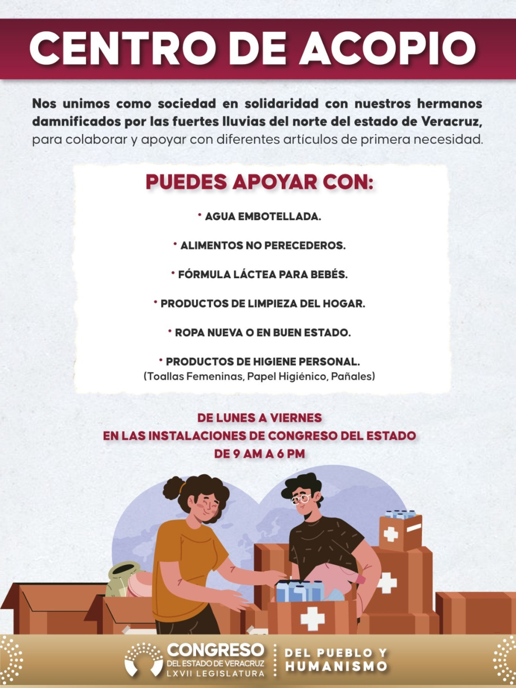 El Congreso del Estado de Veracruz, con el liderazgo del presidente de la Junta de Coordinación Política (Jucopo), diputado Esteban Bautista Hernández, y de la presidenta de la Mesa Directiva, diputada Naomi Edith Gómez Santos, abrió un Centro de Apoyo para el acopio de víveres y productos no perecederos que serán enviados a las familias damnificadas en la región norte de la entidad, por la reciente contingencia climatológica.