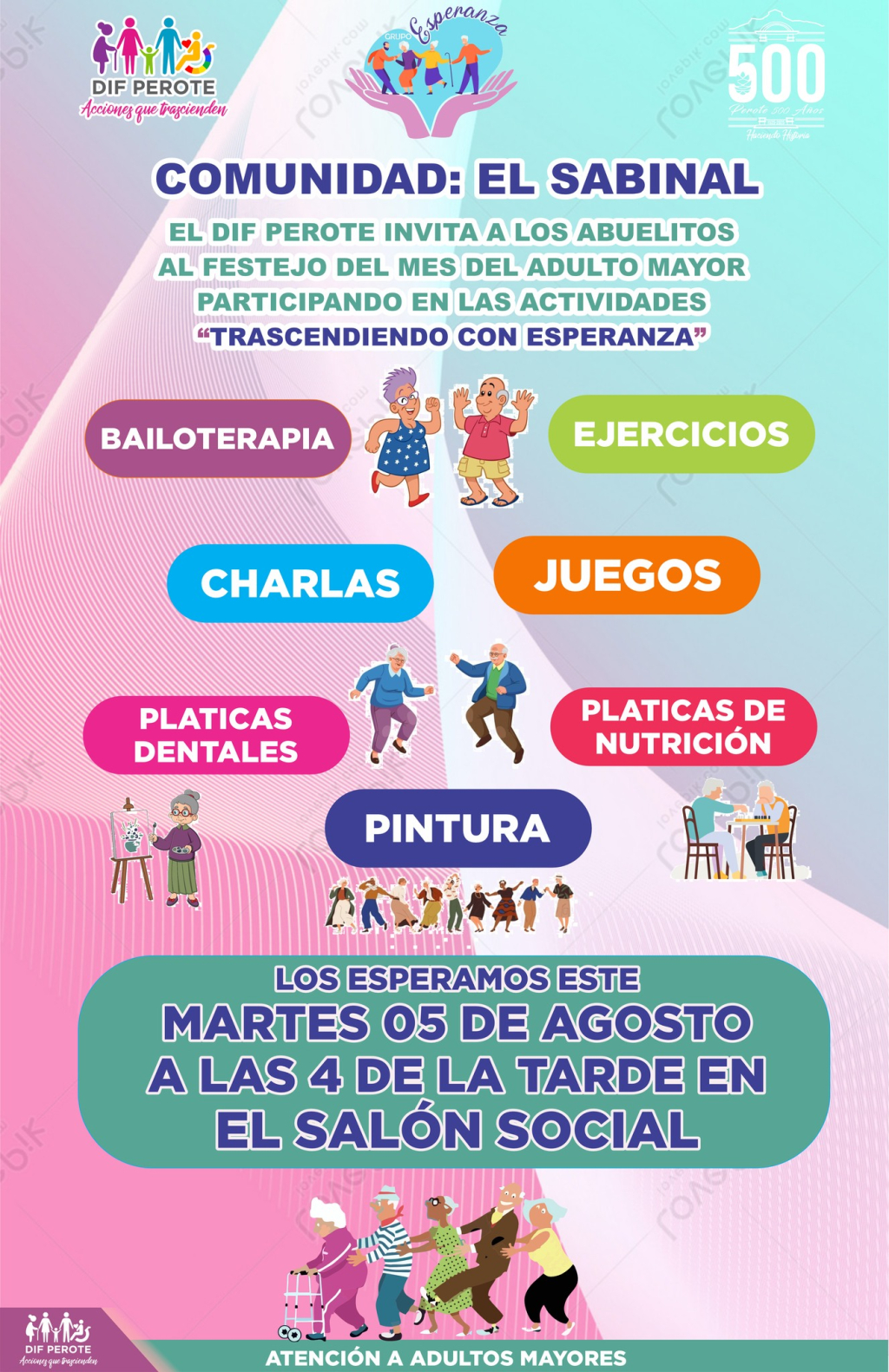Queremos invitar con mucho cariño a todos los abuelitos de la comunidad de El Sabinal este martes 05 de agosto a las 4 de la tarde en el Salón Social, para pasar una tarde especial donde aprenderemos, jugaremos y compartiremos momentos inolvidables. ????