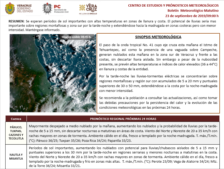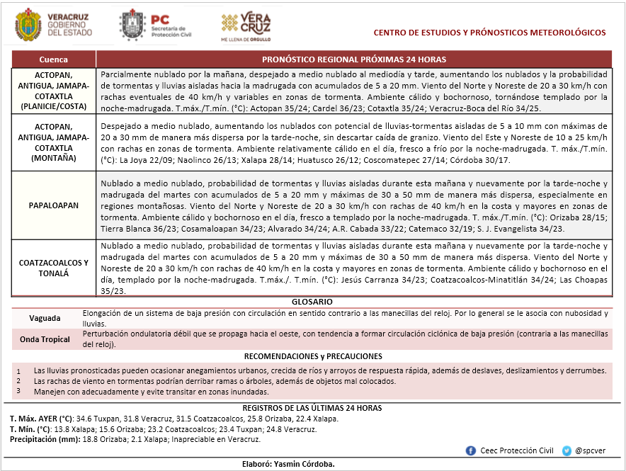 *Regiones montañosas del centro*: Despejado a medio nublado por la mañana, aumentando los nublados y la probabilidad de lluvias aisladas por la tarde-noche acompañadas en algunas zonas de tormentas (actividad eléctrica, ráfagas de viento y probable caída de granizo). Acumulados esperados en 24 horas de 5 a 10 mm con máximas de 20 a 30 mm de manera más dispersa. Viento dominante del Este y Noreste de 10 a 25 km/h con rachas en zonas de tormenta. Tmáx/Tmín. 25-28/14-17°C (menores en el valle de Perote).