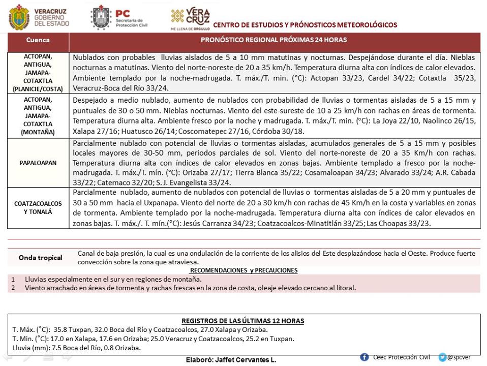 *Resumen*: En las próximas 24 horas la probabilidad mayor para lluvias y tormentas seguirá concentrándose especialmente en regiones montañosas y porción sur de la entidad, asimismo dominará ambiente relativamente caluroso a caluroso mediodía y tarde. El viento dominante será de dirección Este y Sureste en la costa norte, y del Este y Noreste en la costa centro-sur con velocidades de 20 a 35 km/h. Se recomienda continuar con las precauciones pertinentes y seguir las indicaciones de las autoridades municipales de protección civil.