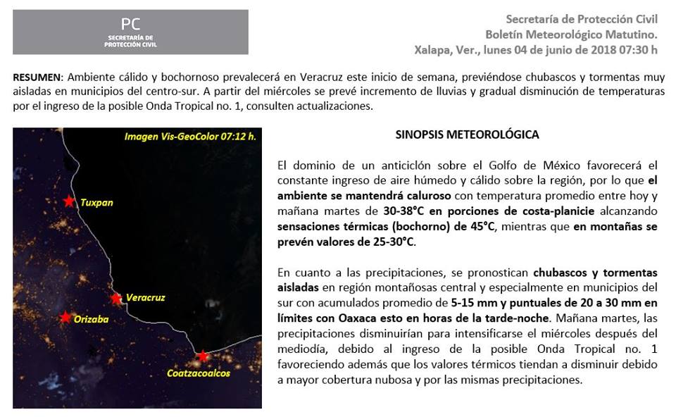 Resumen: Próximas 48 horas persistirá ambiente caluroso en gran parte del estado. La probabilidad tormentas y lluvias de carácter aislado y de tipo ligero a ocasionalmente moderado estará presente especialmente en la zona sur y de manera más aislada en la región montañosa central. El viento dominante continuará del Este y Sureste de 20 a 35 km/h en la costa norte, y del Norte y Noreste en la costa centro-sur con igual velocidad. Se recomienda no exponerse a periodos prolongados al sol, tomar mucha agua y evitar acciones que puedan dar origen a incendios forestales, de pastizales y en basureros.