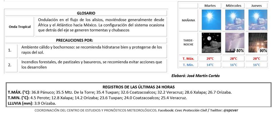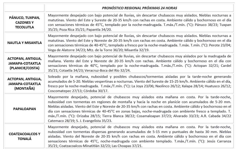 Región Norte (Cuencas del Pánuco al Colipa): Despejado a medio nublado por la mañana, condiciones limitadas para lluvias; sin embargo no se podrían descartar de manera aislada y ligera con acumulados en 24 horas menores de 10 mm en regiones montañosas de las cuencas del Nuatla y Misantla por la tarde-noche. Viento dominante del Este y Sureste de 20 a 35 km/h en la costa. Ambiente caluroso TMáx/TMín 33-37/23-26 (menores en la región de Huayacocotla).