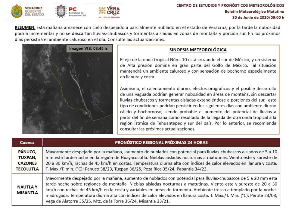 *Región Norte*: (Cuencas del Pánuco al Colipa): Disminución de nublados y de la probabilidad de lluvias y tormentas (actividad eléctrica, ráfagas de viento y caída de granizo) aisladas aumentando nuevamente por la tarde-noche especialmente en regiones montañosas. Acumulados estimados en 24 horas de 5 a 20 mm con máximos de 30 a 50 mm. Calina reduciendo la visibilidad. Nieblas nocturnas a matutinas. Viento dominante del Este y Sureste de 20 a 35 km/h en la costa con rachas de 40 a 50 km/h. Ambiente caluroso al mediodía-tarde. Tmáx. 36-39°C en la Huasteca y 34-36°C en costa. Tmin. 24-27°C (menores en la región de Huayacocotla).