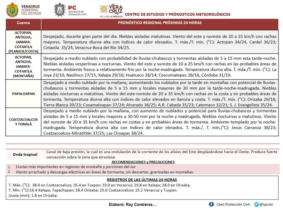 *Región Sur*: (Cuencas del Papaloapan, Coatzacoalcos y Tonalá, incluyendo Los Tuxtlas): Despejado a medio nublado por la mañana, aumentando los nublados y la probabilidad de lluvias y tormentas (actividad eléctrica y ráfagas de viento) aisladas por la tarde-noche y madrugada. Acumulados estimados de 5 a 15 mm con máximos de 20 a 40 mm, estos últimos especialmente en regiones montañosas. Visibilidad reducida por calina. Nieblas nocturnas a matutinas. Viento dominante del Noreste de 20 a 35 km/h en la costa. Ambiente caluroso al mediodía-tarde. Tmáx./Tmín. 33-37/23-26°C (Menores en la región de los Tuxtlas).