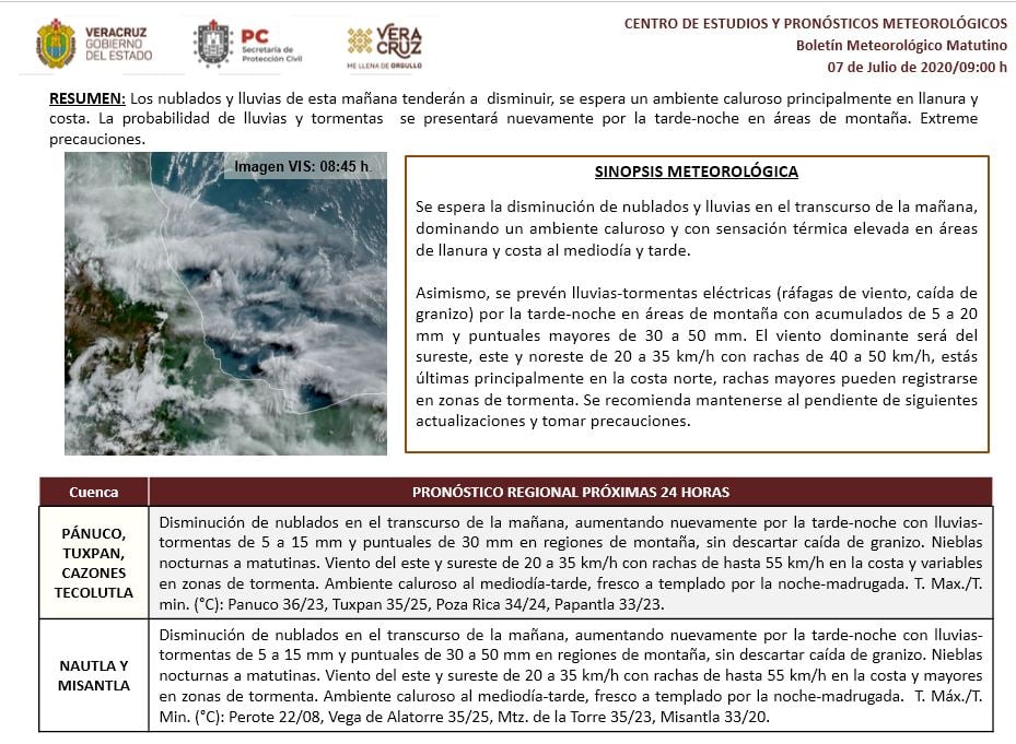 *Resumen*: En las próximas 24 horas la probabilidad mayor para precipitaciones y tormentas de carácter aislado y de intensidad moderada se observa sobre regiones montañosas de nuestra entidad. Así mismo se espera continúe el ambiente caluroso al mediodía-tarde. El viento dominante será del Sureste, Este y Noreste de 20 a 35 km/h con rachas de 40 a 50 km/h, estás últimas principalmente en la costa norte, rachas mayores pueden registrarse en zonas de tormenta. Se recomienda seguir con las precauciones, así como continuar acatando las indicaciones de las autoridades municipales de protección civil.