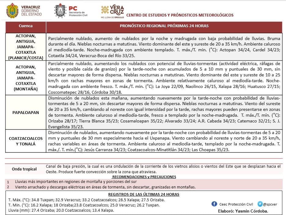 *Región Norte*: (Cuencas del Pánuco al Colipa): Disminución de la nubosidad conforme avance la mañana, aumentando nuevamente con probabilidad de lluvias y tormentas (actividad eléctrica, ráfagas de viento y caída de granizo) aislada por la tarde-noche y madrugada. Acumulados estimados en 24 horas de 5 a 15 mm con máximos de 20 a 40 mm, estas últimas principalmente en regiones montañosas. Nieblas nocturnas a matutinas. Viento dominante del Este y Sureste de 20 a 35 km/h con rachas de 40 a 55 km/h en la costa y principalmente entre Tecolutla y vega de Alatorre, rachas mayores pueden registrarse en zonas de tormenta. Ambiente caluroso al mediodía-tarde. Tmáx. 36-39°C en la Huasteca y 34-36°C en costa. Tmin. 24-27°C (menores en la región de Huayacocotla).