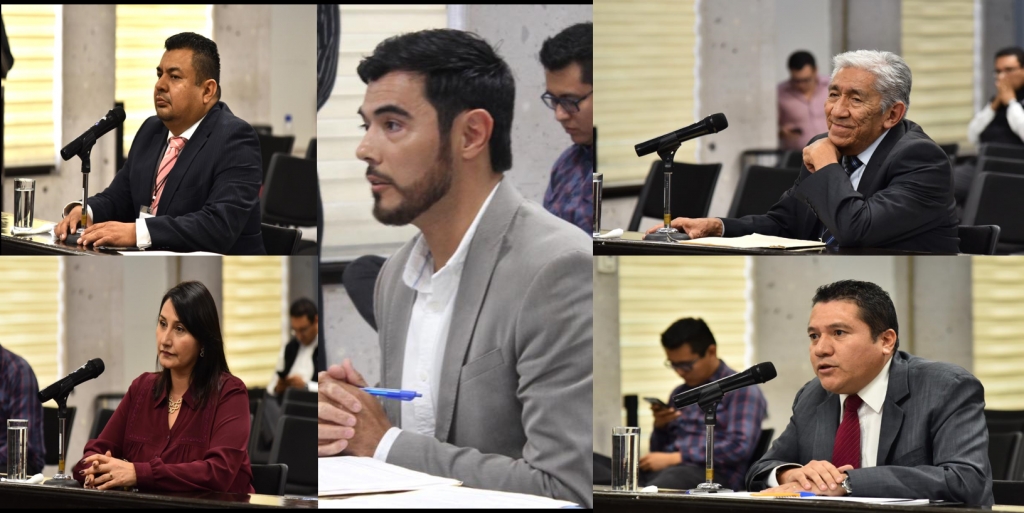 En seguimiento al proceso para nombrar al titular de la Contraloría Interna de la Fiscalía General del Estado (FGE), este miércoles 30 de octubre, los diputados Juan Javier Gómez Cazarín, presidente de la Junta de Coordinación Política (Jucopo), Jorge Moreno Salinas y Alexis Sánchez García, entrevistaron a los ciudadanos Osbal Moncayo Martínez, Claudia Pérez Burguete, Carlo Omar Rizo Contreras, David Sánchez Barradas y Hernán Solís Contreras, aspirantes al cargo.