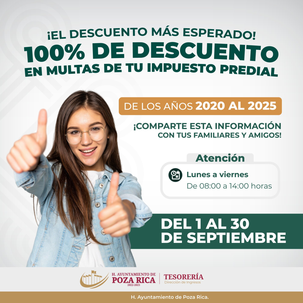 Beneficio válido solo del 01 al 30 de Septiembre. Acude a la oficina de Tesorería y ponte al día sin pagar recargos.