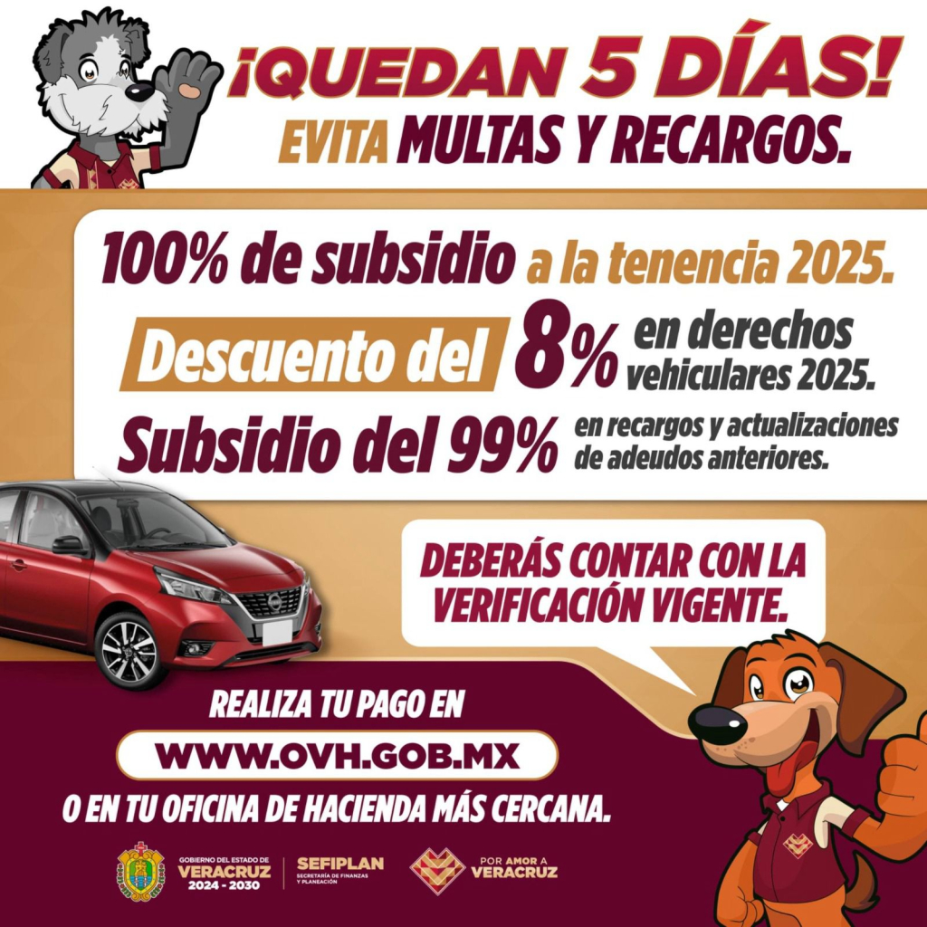 Últimos días para aprovechar el 8 por ciento de descuento en el pago de derechos de control vehicular y evitar el cobro de recargos y actualizaciones; el plazo vence el próximo viernes, informó la Secretaría de Finanzas y Planeación. El costo para automóviles es de mil 154 pesos, mientras que para motocicletas y remolques es de 648. A partir de marzo, se elimina el porcentaje de descuento. Cabe recordar que la verificación vehicular ya tiene carácter obligatorio, para este año tiene un costo de 476 pesos y se requiere estar al corriente con los engomados para acceder al descuento del 8 por ciento. Puede consultarse el adeudo del vehículo en la página www.ovh.gob.mx, es necesario contar con el número de placa y los cinco últimos dígitos de la serie. Para realizar el pago en línea se recomienda a los contribuyentes verificar que la página sea la oficial del Gobierno de Veracruz con terminación .gob.mx; ahí encontrarán las instituciones bancarias y tiendas de conveniencia autorizadas para el cobro de impuestos estatales. Para mayor información, pueden consultar también las redes sociales oficiales Facebook: MiHaciendaVeracruz, X: @SEFIPLANVer_, o en la línea telefónica 800 260 24 00, de 08:00 a 18:00 horas.