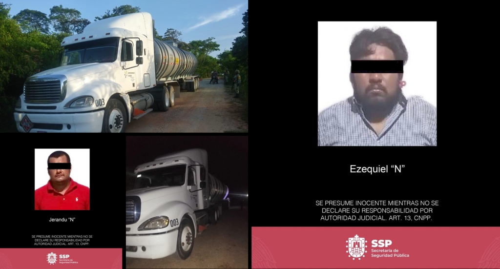 La Secretaría de Seguridad Pública (SSP), a través de efectivos de la Policía Estatal con base en esta ciudad, capturó a Jerandu "N" y Ezequiel "N", cuando transportaban 20 mil litros de hidrocarburo de dudosa procedencia.