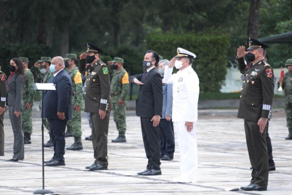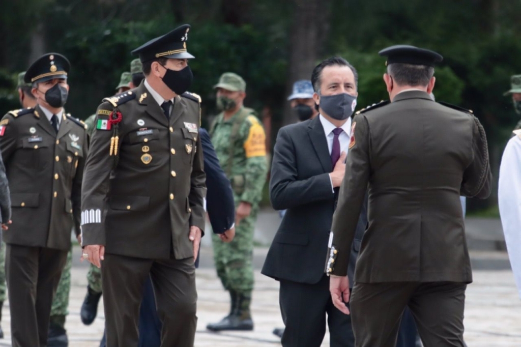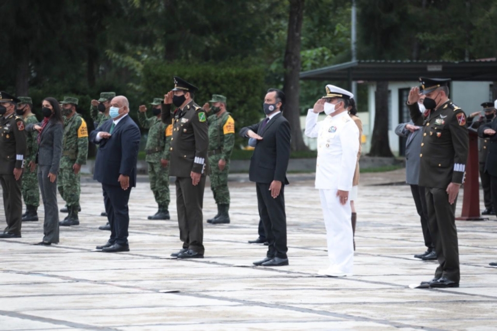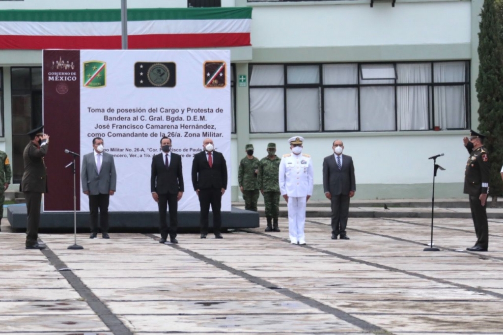 Emiliano Zapata, Ver., 01/09/21.- El gobernador Cuitláhuac García Jiménez participó en la ceremonia de toma de posesión y protesta de Bandera al General de Brigada D.E.M., José Francisco Camarena Hernández, como Comandante de la 26ª. Zona Militar con sede en las instalaciones del 63 Batallón de Infantería.