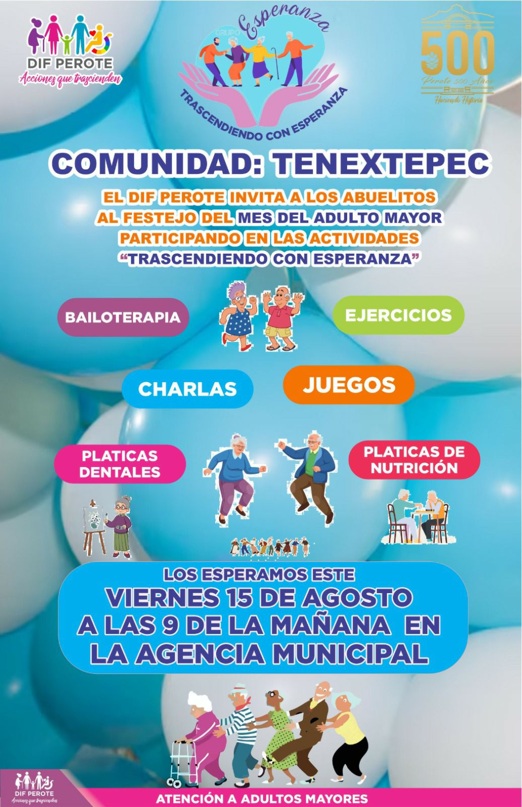 Atención, invitamos a las y los abuelitos de la comunidad de Tenextepec al festejo del mes del Adulto Mayor "Trascendido con Esperanza", dónde tendremos pláticas, baile, juegos y muchas sorpresas.