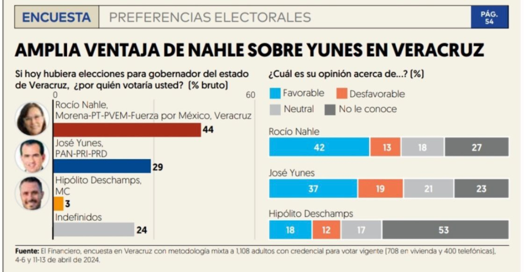 Al responder la pregunta "Si hoy hubiera elecciones para gobernador en el estado de Veracruz ¿por quién votaría usted?" la preferencia electoral poscionó a Rocío Nahle García con un 44%, mientras que José Yunes alcanzó solo un 29%.