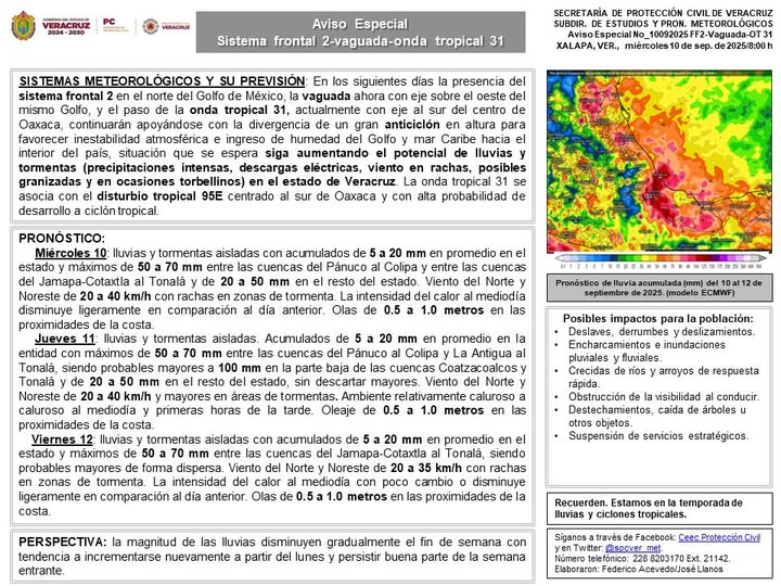 SISTEMAS METEOROLÓGICOS Y SU PREVISIÓN: En los siguientes días la presencia del sistema frontal 2 en el norte del Golfo de México, la vaguada ahora con eje sobre el oeste del mismo Golfo, y el paso de la onda tropical 31, actualmente con eje al sur del centro de Oaxaca, continuarán apoyándose con la divergencia de un gran anticiclón en altura para favorecer inestabilidad atmosférica e ingreso de humedad del Golfo y mar Caribe hacia el interior del país, situación que se espera siga aumentando el potencial de lluvias y tormentas (precipitaciones intensas, descargas eléctricas, viento en rachas, posibles granizadas y en ocasiones torbellinos) en el estado de Veracruz. La onda tropical 31 se asocia con el disturbio tropical 95E centrado al sur de Oaxaca y con alta probabilidad de desarrollo a ciclón tropical.