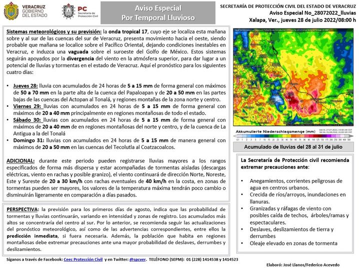 Sistemas meteorológicos y su previsión: la onda tropical 17, cuyo eje se localiza esta mañana sobre y al sur de las cuencas del sur de Veracruz, presenta movimiento hacia el oeste, siendo probable que mañana se localice sobre el Pacífico Oriental, dejando condiciones inestables en Veracruz, e induzca una vaguada sobre el suroeste del Golfo de México. Estos sistemas seguirán apoyados por la divergencia del viento en la atmósfera superior, para dar lugar a un potencial de lluvias y tormentas en el estado de Veracruz. Aquí el pronóstico para los siguientes cuatro días:
