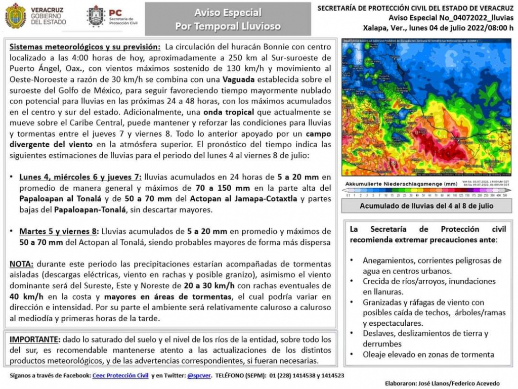 Sistemas meteorológicos y su previsión: La circulación del huracán Bonnie con centro localizado a las 4:00 horas de hoy, aproximadamente a 250 km al Sur-suroeste de Puerto Ángel, Oax., con vientos máximos sostenido de 130 km/h y movimiento al Oeste-Noroeste a razón de 30 km/h se combina con una Vaguada establecida sobre el suroeste del Golfo de México, para seguir favoreciendo tiempo mayormente nublado con potencial para lluvias en las próximas 24 a 48 horas, con los máximos acumulados en el centro y sur del estado. Adicionalmente, una onda tropical que actualmente se mueve sobre el Caribe Central, puede mantener y reforzar las condiciones para lluvias y tormentas entre el jueves 7 y viernes 8. Todo lo anterior apoyado por un campo divergente del viento en la atmósfera superior. El pronóstico del tiempo indica las siguientes estimaciones de lluvias para el periodo del lunes 4 al viernes 8 de julio: