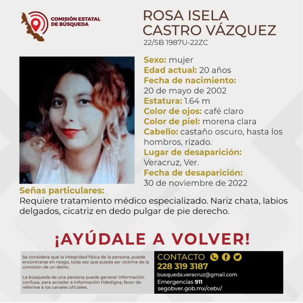 La Comisión Estatal de Búsqueda de Veracruz (CEBV), solicita la colaboración de la ciudadanía para localizar a Rosa Isela Castro Vázquez, de 20 años de edad, vista por última vez el pasado 30 de noviembre en la ciudad de Veracruz.