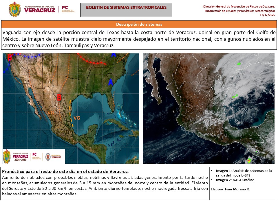Aumento de nublados con probables nieblas, neblinas y lloviznas aisladas generalmente por la tarde-noche en montañas, acumulados generales de 5 a 15 mm en montañas del norte y centro de la entidad. El viento del Sureste y Este de 20 a 30 km/h en costas. Ambiente diurno templado, noche-madrugada fresca a fría con heladas al amanecer en altas montañas.