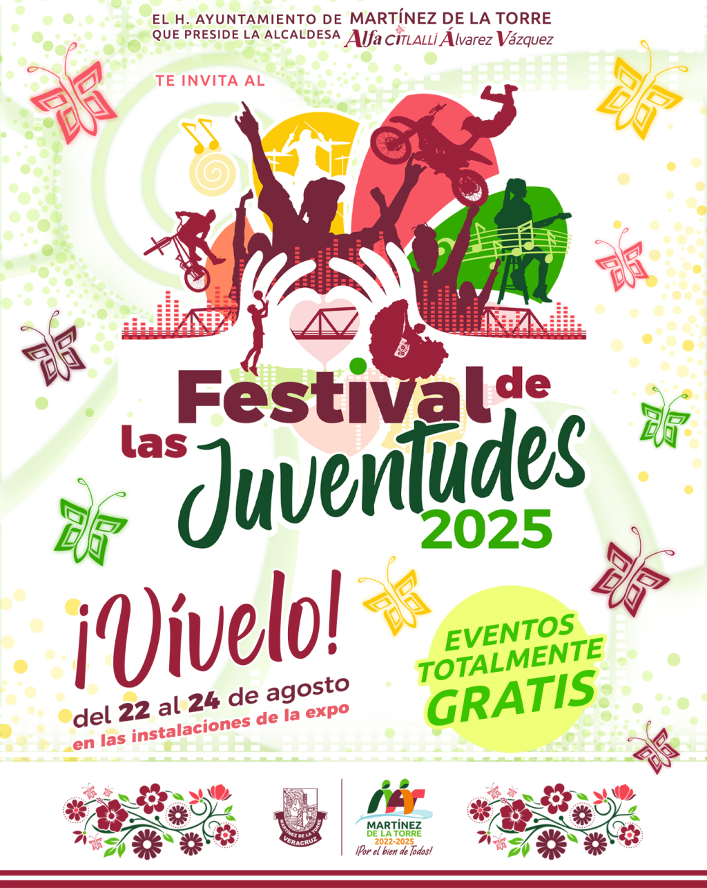Estamos más cerca del Festival de las Juventudes del 22 al 24 de agosto, checa la cartelera y asiste. Te esperamos en los conciertos, talleres, eventos deportivos y el espectáculo de Freestyle motocross.
