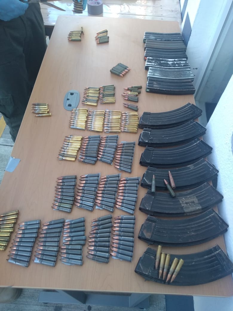 Al inspeccionarle el vehículo encontraron dos armas AK-47, una AR-15, 13 cargadores de distintos calibres, 1 máscara, 1 pechera, 50 “ponchallantas”, 2 chalecos tácticos, placas balísticas y 300 cartuchos útiles; además de una cartulina en la que se exigía el cobro de 5 mil pesos a cambio de permitir que un establecimiento siguiese operando.
