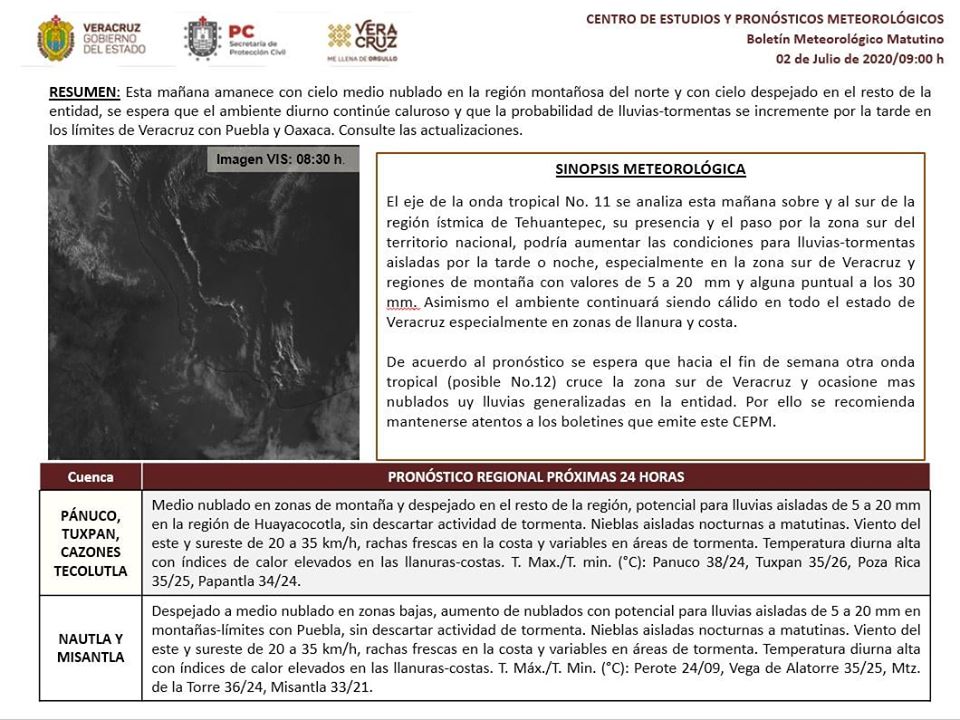 *Resumen*: En las próximas 24 horas se espera aumenten las condiciones para tormentas y precipitaciones especialmente del centro al sur de nuestra entidad. El viento dominante será del Este y Sureste de 20 a 30 km/h en la costa centro con rachas de 40 km/h; mientras en la costa centro-sur será del Norte y Noreste de 20 a 35 km/h. Rachas mayores pueden presentarse en áreas de tormenta. La concentración del Polvo del Sahara disminuye. Se recomienda continuar con las precauciones pertinentes y seguir las indicaciones de las autoridades municipales de protección civil.